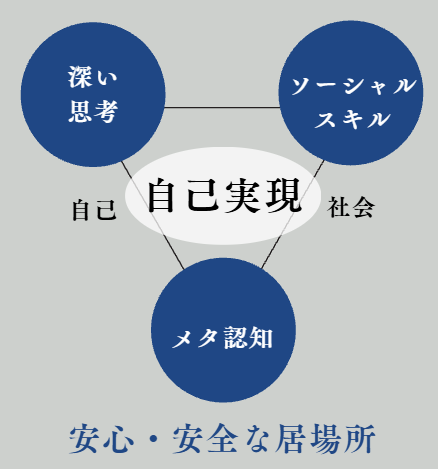そこで本プログラムでは、メタ認知・深い思考・ソーシャルスキルの3つの柱を総合的に網羅することで、ギフテッド・2Eの子どもたちの自己実現に必要な力の養成をねらっています。